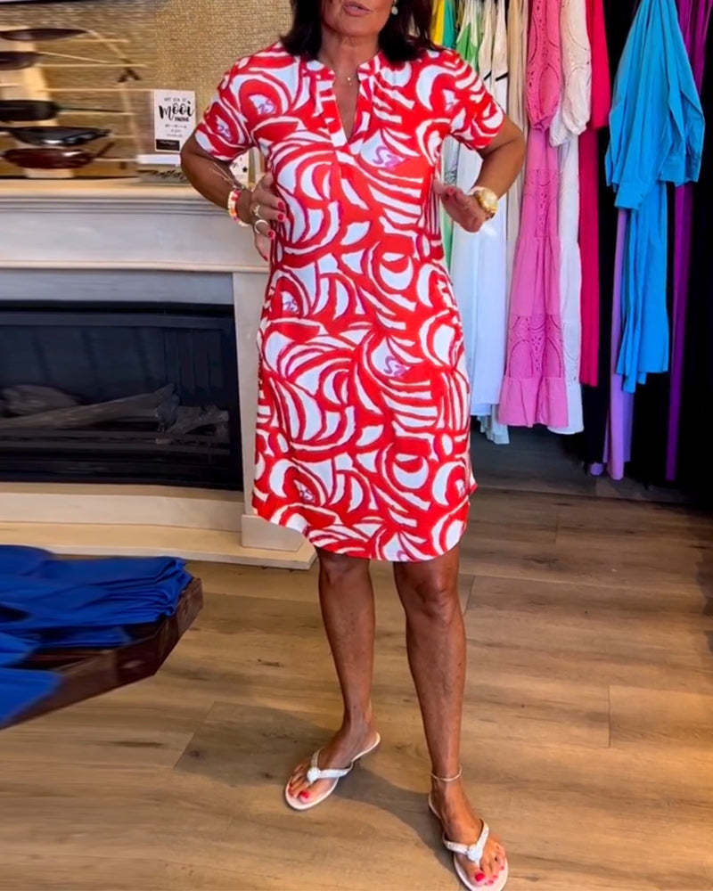 Women's Fashion Temperament Short Sleeve Printed V-neck Dress
